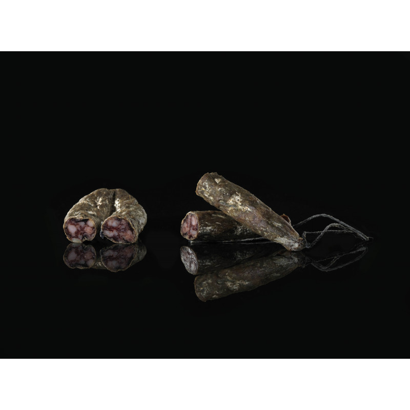 Le Figatellu est le produit emblématique du savoir faire charcutier traditionnel corse : notre figatellu est issu de cochons de la race Corse dite Nustrale. Cette saucisse est embossée dans un boyau nautrel de porc (de faible diamètre) à base de foie (33%), de gras et maigre de porc, parfumée d'épices et de condiments. Nous sacrifions d'ailleurs une joue par cochon dans nos figatelli pour leur conférer un goût unique et typique. Après une sèche de 2 mois, le figatellu sec est à consommer sec comme un saucisson. Il va révéler d'autres parfums en bouche que le figatellu frais, dû à la maturation du produit, il est idéal pour les apéritifs. Disponible à partir du mois de mars.